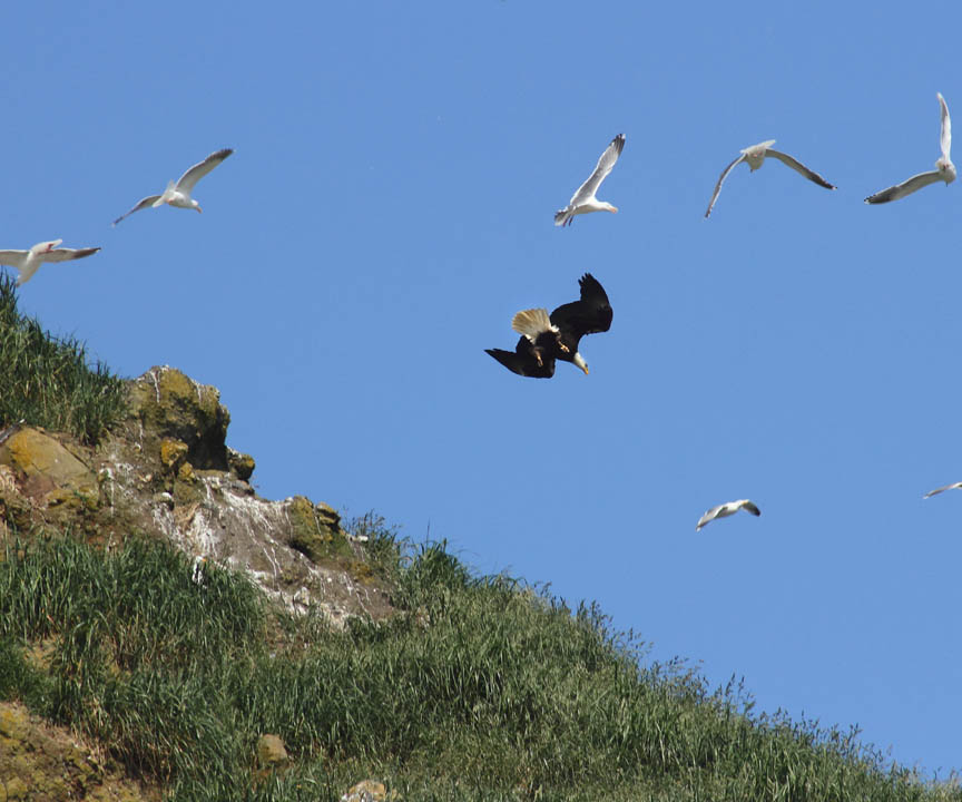 Bald Eagles dive onto Haystack Rock to raid on the nesting birds. Most common prey is the Common Muir.